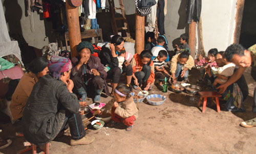 對(duì)于偏遠(yuǎn)山區(qū)的貧困與落后,雖然隊(duì)員們?cè)缬行睦頊?zhǔn)備,但實(shí)際到了兩河口鎮(zhèn),當(dāng)?shù)仄D苦的條件還是遠(yuǎn)遠(yuǎn)超出了這群在大城市里生活慣了的年輕人的想象。沒(méi)有網(wǎng)絡(luò),白天斷電,有時(shí)為了發(fā)送一條短信打一個(gè)電話需要走很遠(yuǎn)的路才會(huì)有信號(hào)。飲食也是一大挑戰(zhàn),實(shí)踐隊(duì)的伙食是清一色的土豆,而且一天只有兩頓土豆,這是當(dāng)?shù)氐牧?xí)俗。沒(méi)有桌子,所有人就在地上吃,沒(méi)有筷子就用手。煮的土豆吃膩了就吃烤土豆,扒皮后蘸點(diǎn)調(diào)料,吃得滿嘴滿手黑乎乎的。對(duì)于這樣的飲食方式,隊(duì)員們一開(kāi)始的確不適應(yīng),覺(jué)得有點(diǎn)落后和不衛(wèi)生,但面對(duì)彝家人的熱情好客,隊(duì)員們也就入鄉(xiāng)隨俗,和彝家人一起享用起大山里的土豆來(lái)。為了感謝隊(duì)員們的付出,彝家人偶爾也會(huì)給隊(duì)員們做蕎麥餅換換口味。
